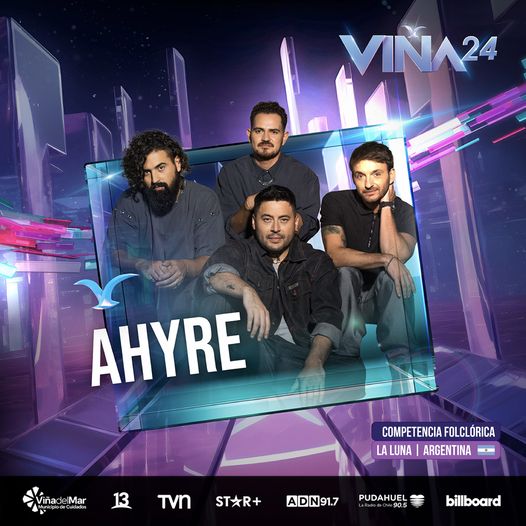 El grupo folklórico #Ahyre (que integran Juan José Vasconcellos, Hernando Mónico, Federico Maldonado y Sebastián Giménez), representará a la Argentina en el Festival Internacional de la Canción de #ViñadelMar 2024 (Chile), con la canción «La Luna».