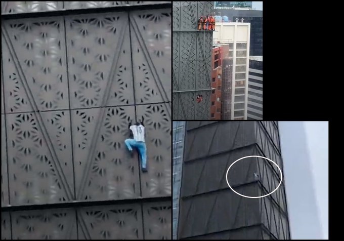 Tensión en #PuertoMadero por un hombre que trepó un edificio sin red ni arnés, y llegó al piso 20 hasta que fue detenido. La policía determinó que se trata del influencer Marcin Banot, ciudadano polaco, vestía una camiseta de la Selección #Argentina al momento del hecho.