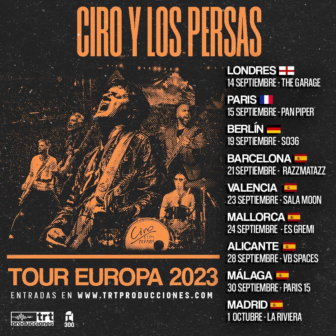 La banda de rock Ciro y los Persas anunció shows para el 14 de septiembre en Londres, Inglaterra; 15 de septiembre en París, Francia; el 19 de septiembre en Berlín, Alemania; y en España es donde más presentaciones llevarán a cabo: 21 de septiembre en Barcelona, 23 de septiembre en Valencia, el 24 en Mallorca, el 28 en Alicante, el 30 en Málaga y cerrará la gira europea el 1 de octubre en Madrid.