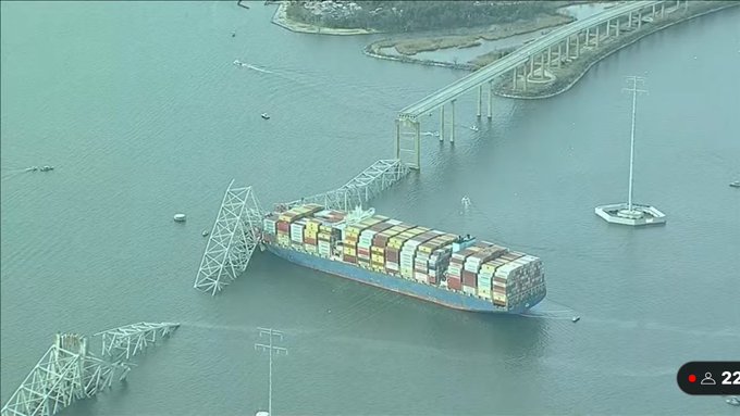 Un barco carguero impactó contra el #puente Francis Scott Key en #Baltimore, #Maryland, el cual se desplomó. Varios autos cayeron y se buscan al menos 7 desaparecidos en el agua. Hasta el momento dos personas han sido salvadas del agua.