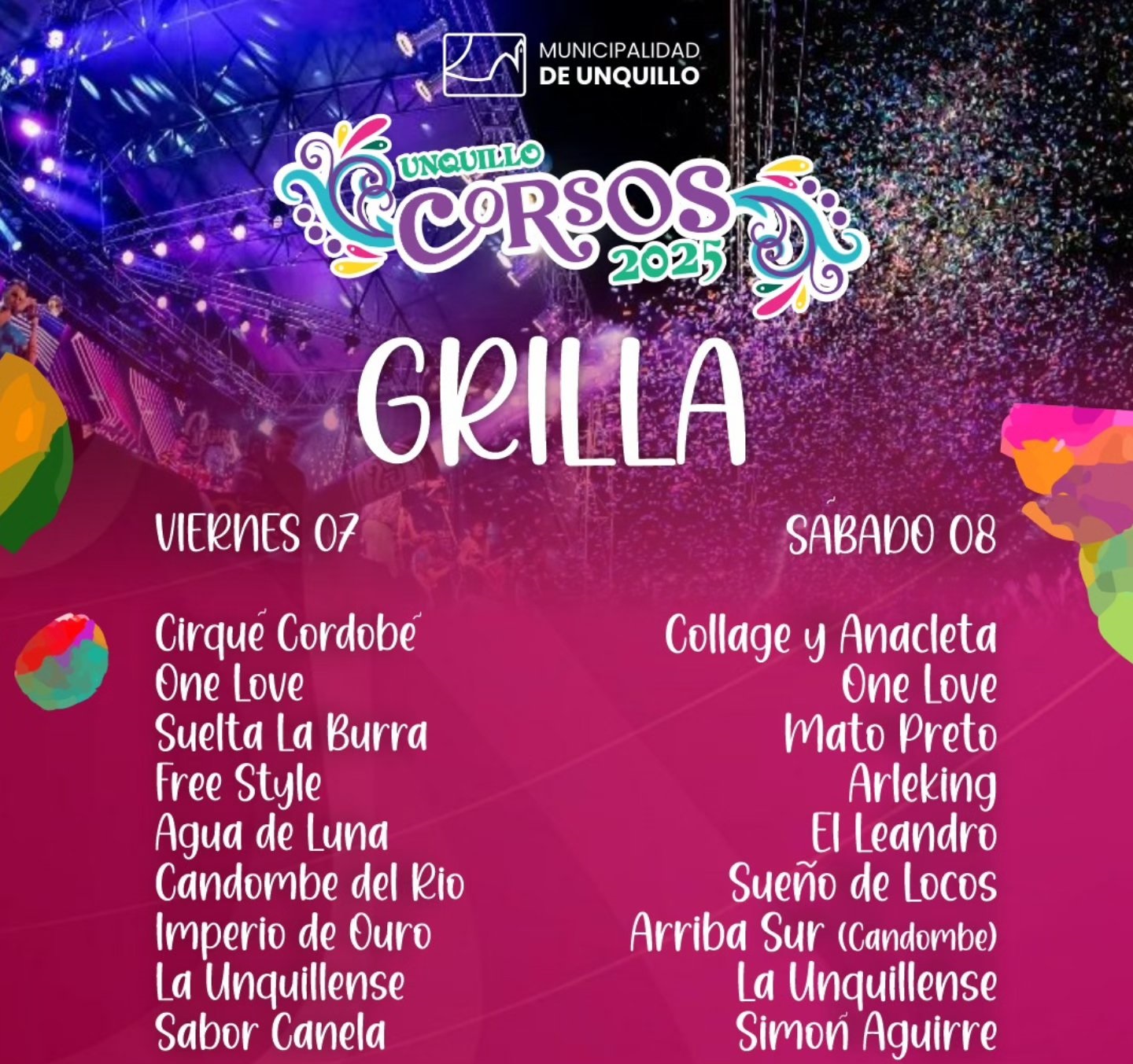 Durante ambas noches, los asistentes podrán disfrutar de una variada grilla de actividades que incluirá bandas como Sabor Canela y Simón Aguirre, además de destacadas murgas como la emblemática La Unquillense, que se presentará con casi 200 integrantes y una producción propia que ha trabajado todo el año en la Escuela Municipal de Artes de Carnaval.