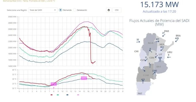 Las llamas de un incendio en un pastizal, fuego cuyo origen todavía no ha sido aclarado, alcanzó a una línea de alta tensión en General Rodríguez, al oeste de Capital Federal, y desencadenó la desconexión del sistema nacional de varias centrales eléctricas por protocolos de protección. 20 millones de argentinos quedaron sin luz en la tarde de este miércoles.