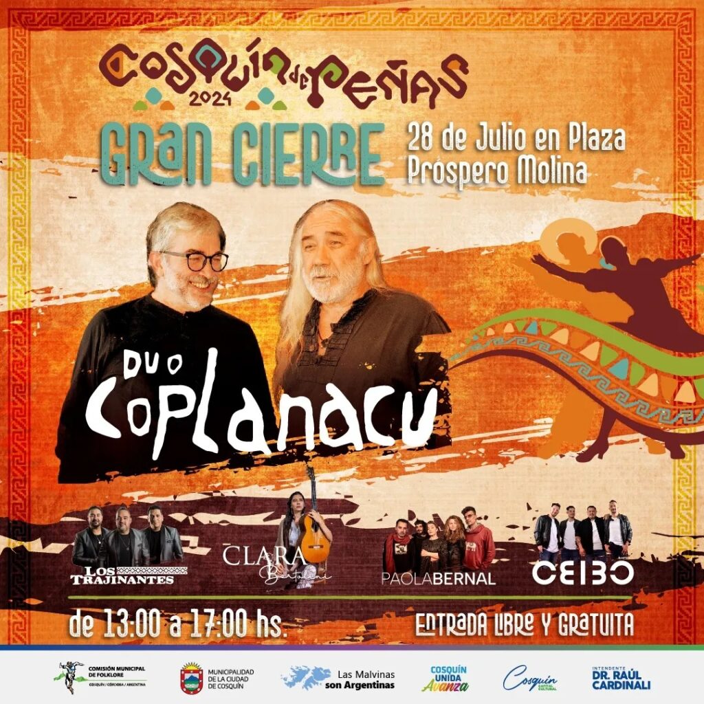 Gran cierre del Circuito Peñero #Cosquín de #Peñas 2024 en la mítica Plaza Próspero Molina, una gran tarde con artistas locales y de lo mejor del #folklore del Dúo Coplanacu, Ceibo, Paola Bernal, Los Trajinantes, Clara Bertolini. Este domingo 28 de julio a las 13:00hs.