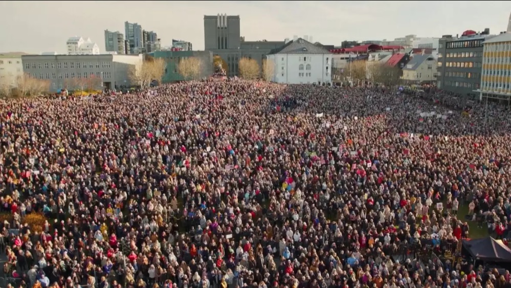 Decenas de miles de mujeres en Islandia, incluida la primera ministra Katrín Jakobsdóttir y varias integrantes de su gabinete, pararon el 24 de octubre. Lo hicieron como parte del «Kvennafrí» (Día libre de la mujer), convocado en protesta por la brecha salarial de género y la violencia de género en el país nórdico. Los campos en los que las mujeres constituyen la mayoría de los trabajadores, como la atención sanitaria y la educación, se ven especialmente afectados por esta problemática. La protesta marca la primera huelga de mujeres de un día completo desde 1975.