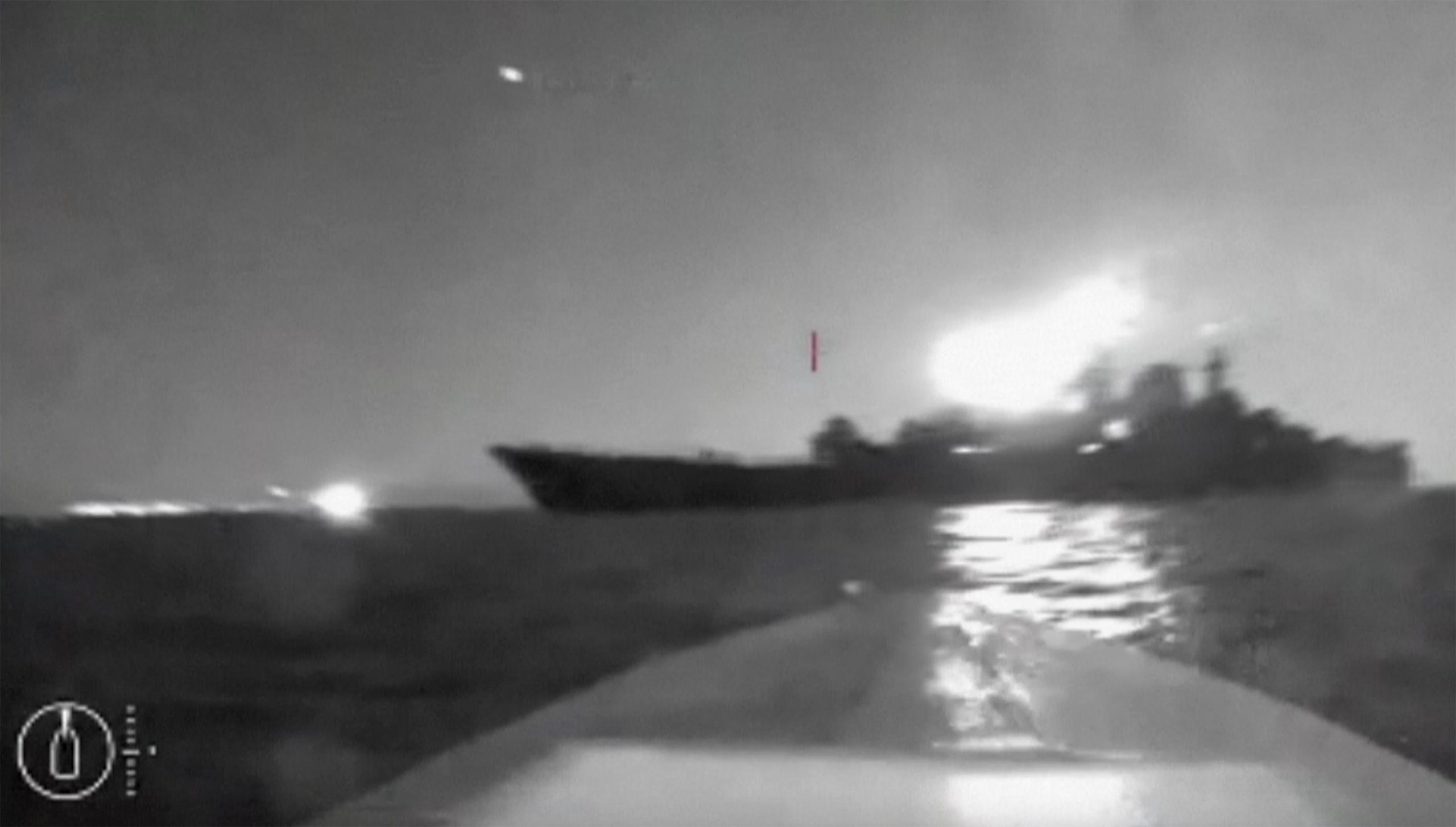 La agencia de inteligencia naval ucraniana GUR publicó un video que muestra, dijo, a sus drones navales atacando la corbeta misilística rusa Ivanovets el miércoles por la noche.
