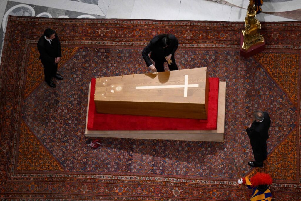 Sobre el rostro de Francisco se colocó un velo de seda blanca. Luego, se roció su cuerpo con agua bendita, mientras los presentes rezaban en silencio. Dentro del féretro se introdujo una bolsa con monedas y medallas acuñadas durante su pontificado, y un cilindro metálico con el rogito, un acta en latín que resume su vida, su obra y su legado: su lucha contra los abusos en la Iglesia, su defensa del medioambiente, su opción por los pobres.